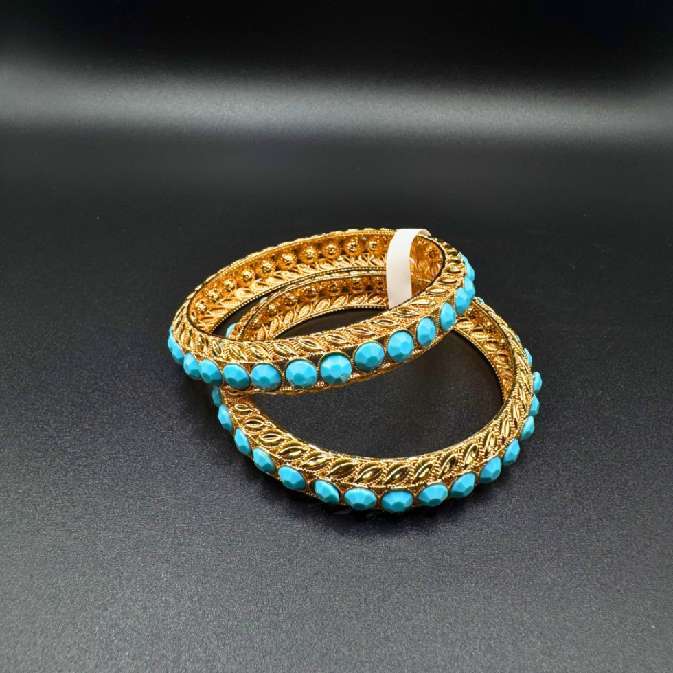 Featuring a beautifully aligned row of round aqua-colored stones set in a rich gold-tone finish, these bangles offer a refined and eye-catching look. The intricate textured pattern along the edges adds an extra touch of elegance and craftsmanship.
