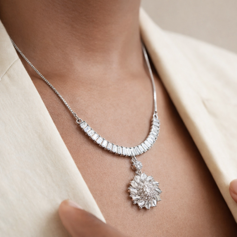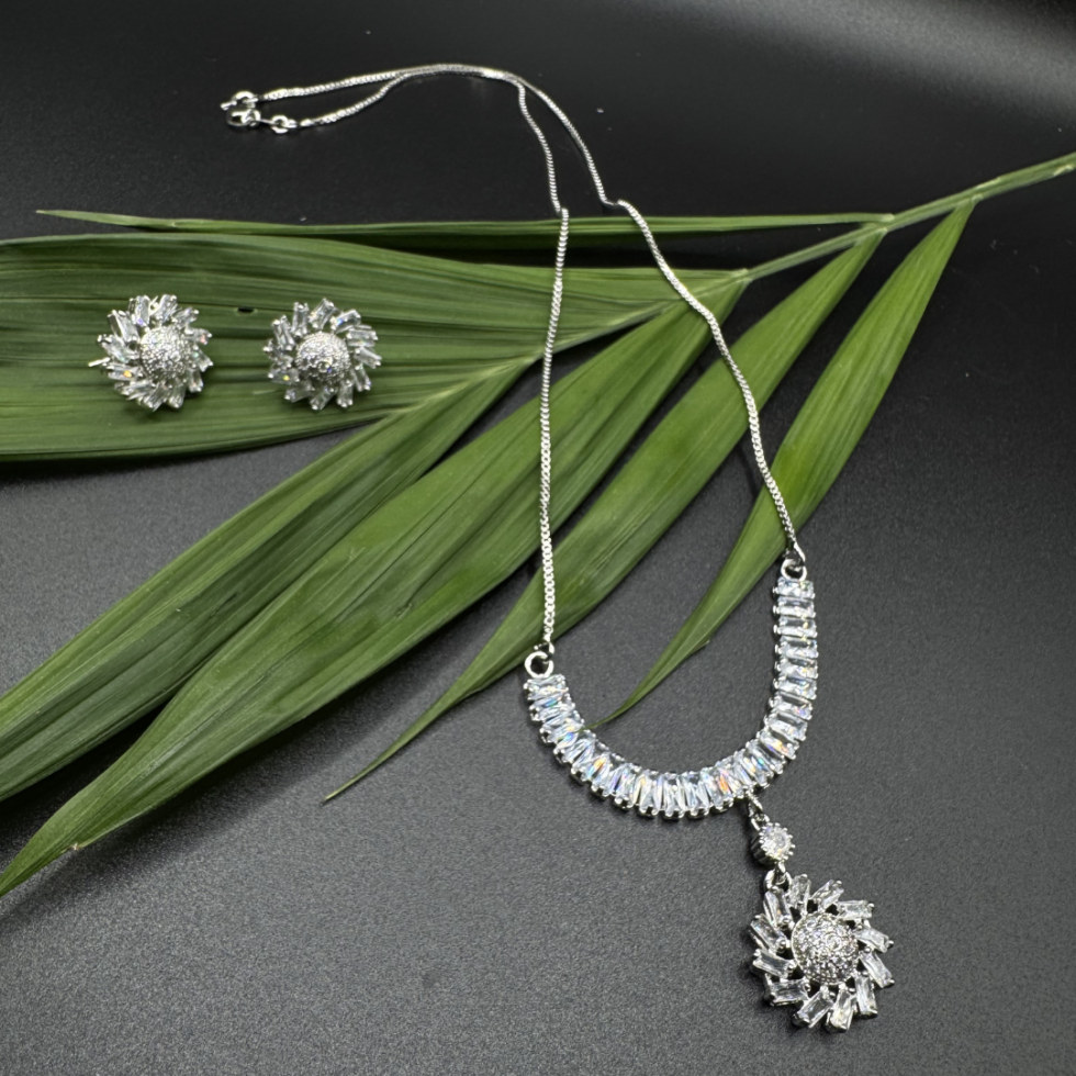 The necklace sits gracefully along the neckline, making it ideal for both formal occasions and elevated everyday wear. Paired with matching drop earrings and a coordinated bracelet, this set offers a cohesive and polished aesthetic. Its lightweight construction ensures comfort, while the intricate detailing reflects premium craftsmanship.
