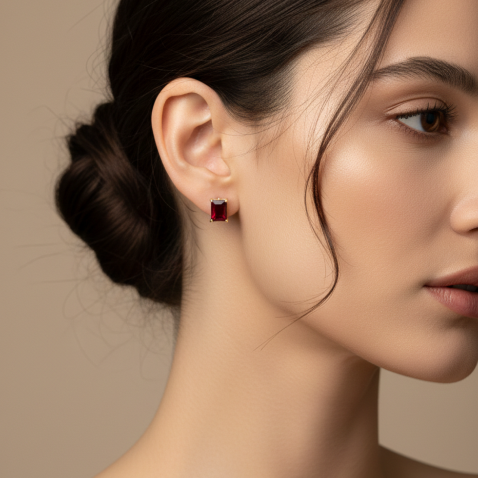 The Crimson Éclat Stud Earrings are a celebration of confident elegance and classic design. Featuring deep ruby-red rectangular stones, these studs are precision-cut to reflect light beautifully, creating a rich and captivating glow with every movement. Each stone is securely set in a polished gold frame, enhancing its depth and brilliance.