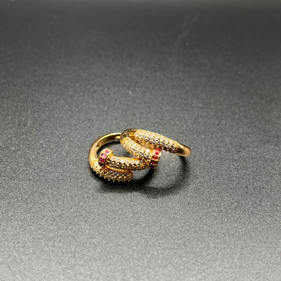 The Crimson Link Luxe Ring is a powerful expression of modern luxury. Crafted in a rich gold-tone finish, this statement ring showcases an interlinked silhouette, symbolizing strength and connection. The surface is adorned with rows of sparkling crystals, while subtle crimson-red accents add a bold contrast and a touch of opulence.