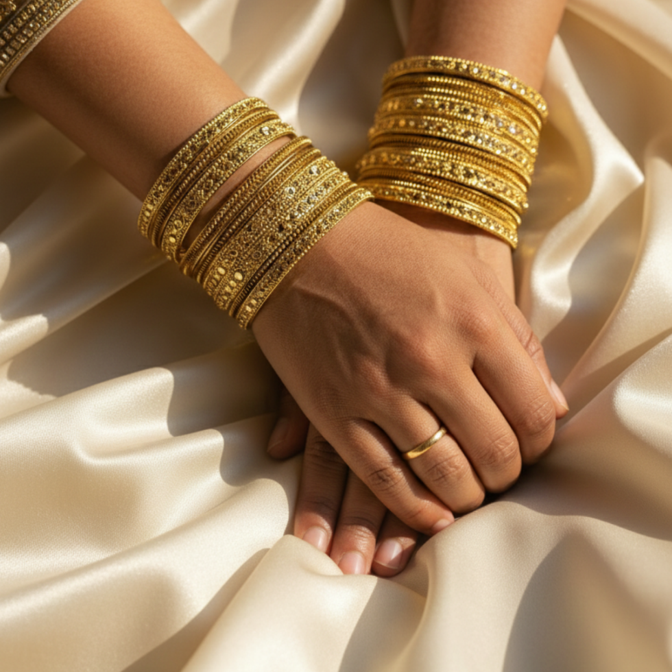 Rich Gold Luster: Every bangle is finished with a warm, deep gold tone that beautifully enhances intricate henna art and heavy bridal embroidery.