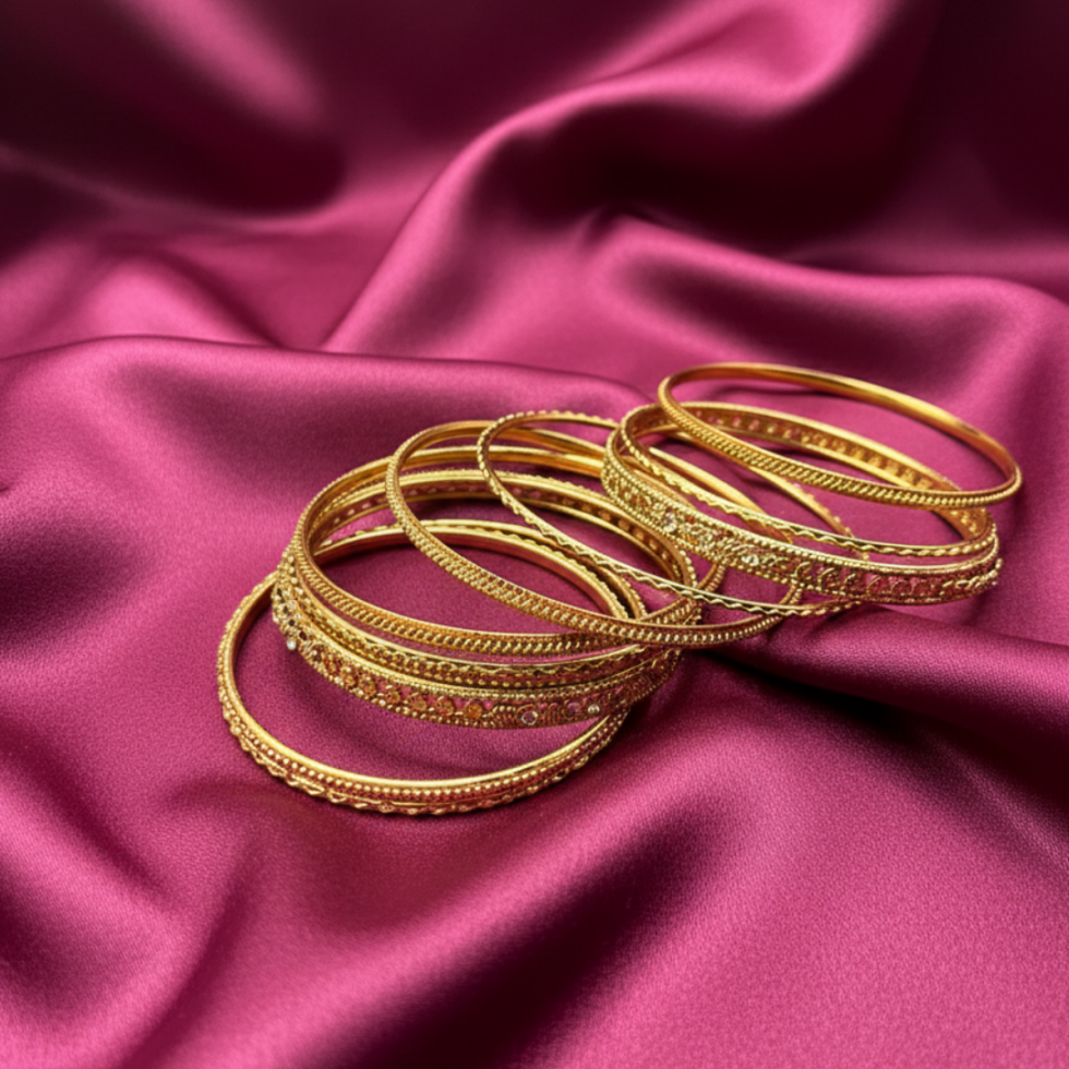 Intricate “Jaali” and “Rassa” Artistry: The stack showcases a beautiful contrast between delicate latticework (jaali) patterns and bold, twisted rope (rassa) designs, creating a sophisticated and regal look.