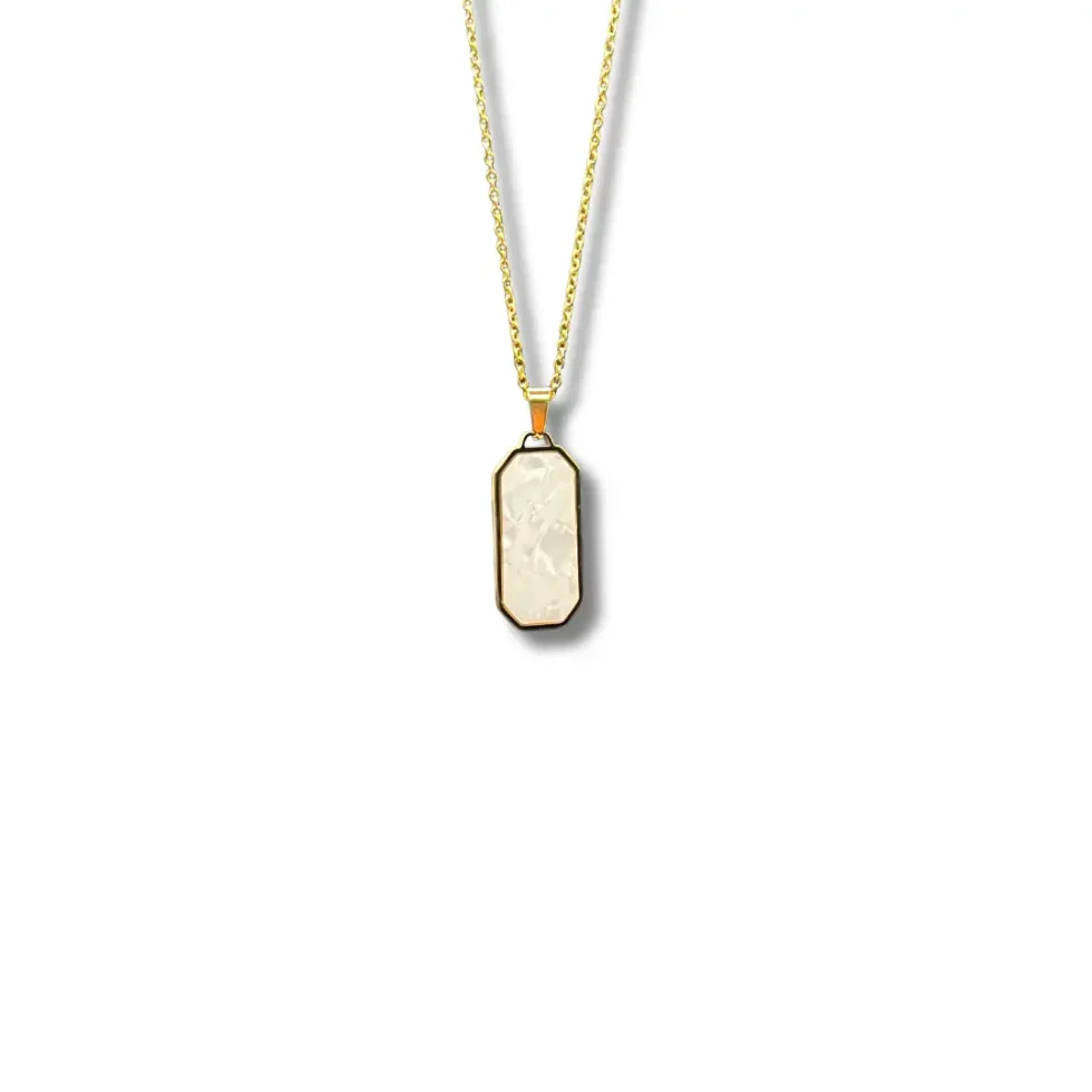 This refined necklace is crafted from high-quality stainless steel and finished with rich 18K gold plating, offering durability with a luxurious shine. The centerpiece is a soft, luminous stone pendant, cut in a modern geometric shape and encased in a polished gold frame for a sophisticated finish.