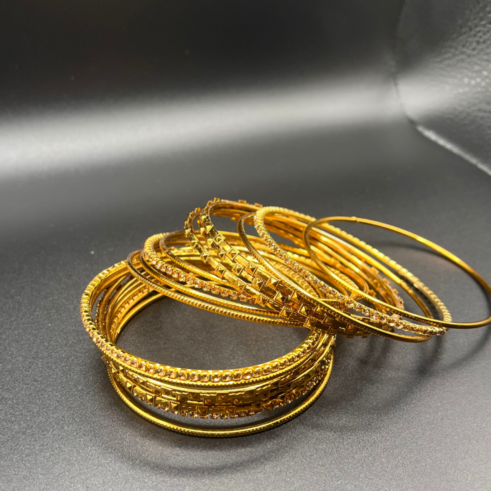A radiant gold-toned bangle stack with intricate detailing, set against rich crimson elegance for a timeless festive look.