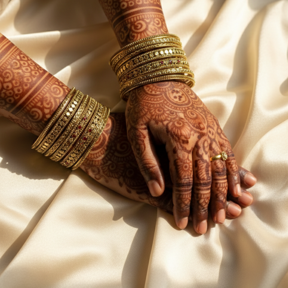 Premium Gold Finish: Every piece is finished with a deep, warm gold luster that serves as the perfect complement to rich bridal fabrics and intricate henna art.