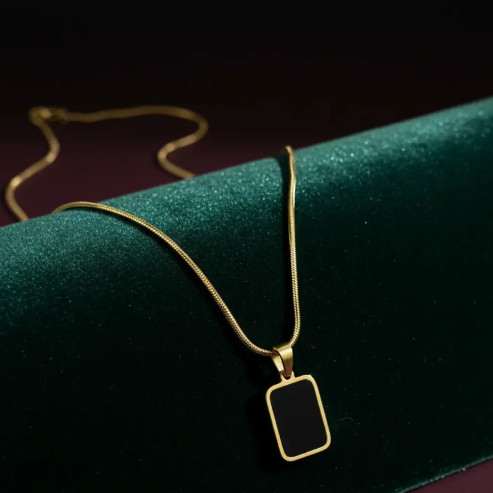 Crafted from high-quality stainless steel and finished with luxurious 18K gold plating, this necklace is designed to deliver both style and durability. The piece features a clean rectangular black pendant, framed in gold for a bold yet minimalist statement.