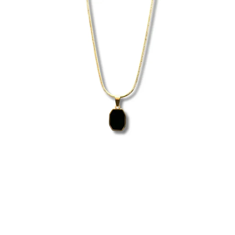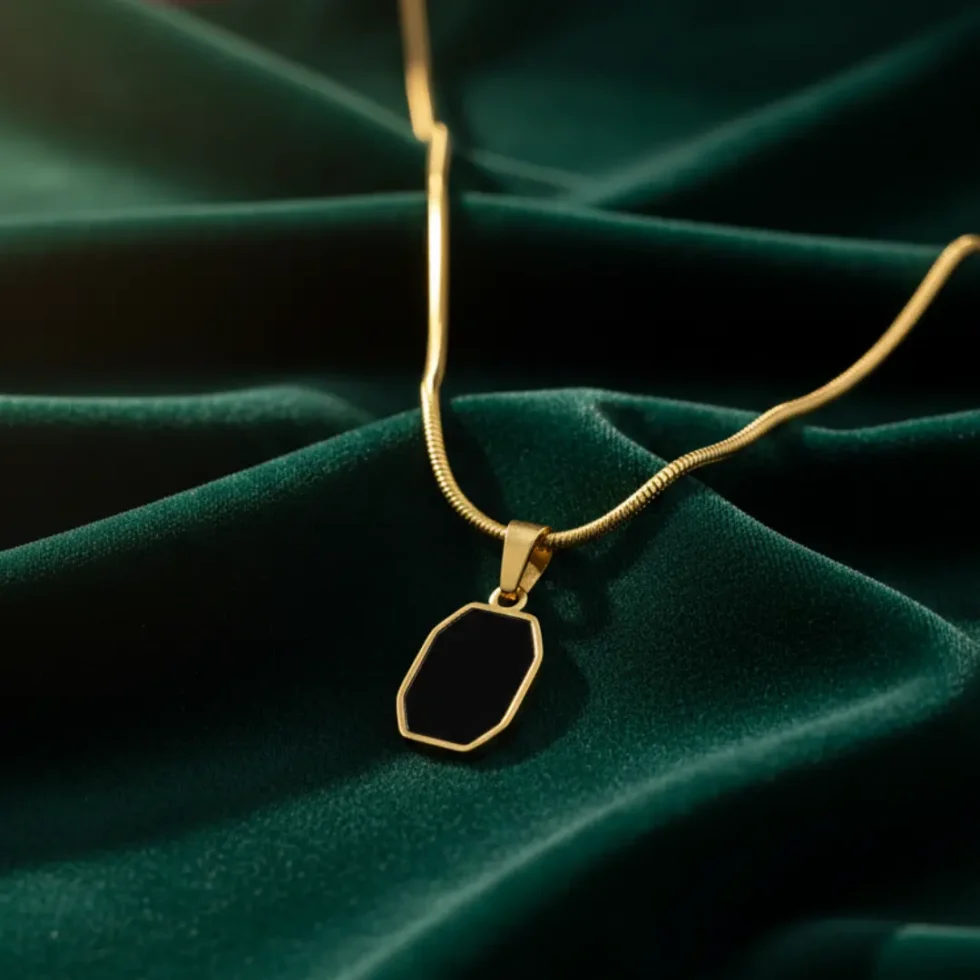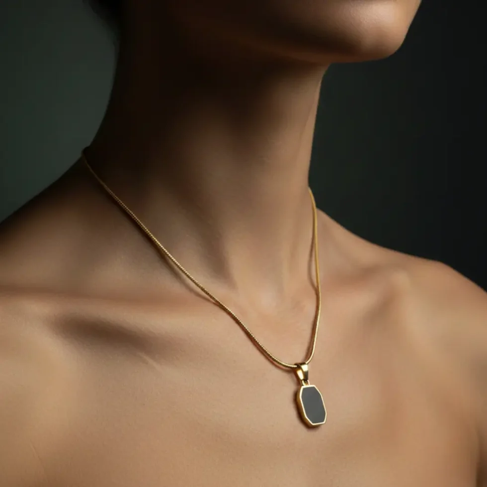 The Noir Edge Pendant is a refined expression of contemporary luxury. Designed with a smooth black centerpiece encased in a polished gold-toned frame, this pendant offers a bold yet understated aesthetic that elevates any look.