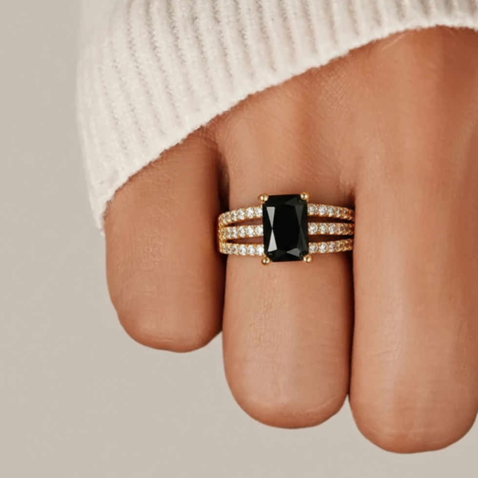 The Obsidian Royale Ring is crafted for those who command attention with effortless confidence. Set in a rich gold-tone finish, the ring features a dramatic emerald-cut black stone at its center, symbolizing power, elegance, and mystery. The band is detailed with multiple rows of finely set crystals, adding a refined sparkle that perfectly balances the stone’s deep intensity.