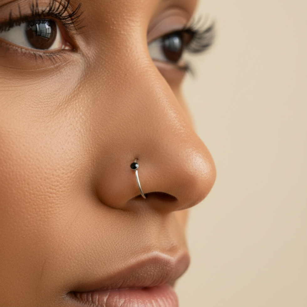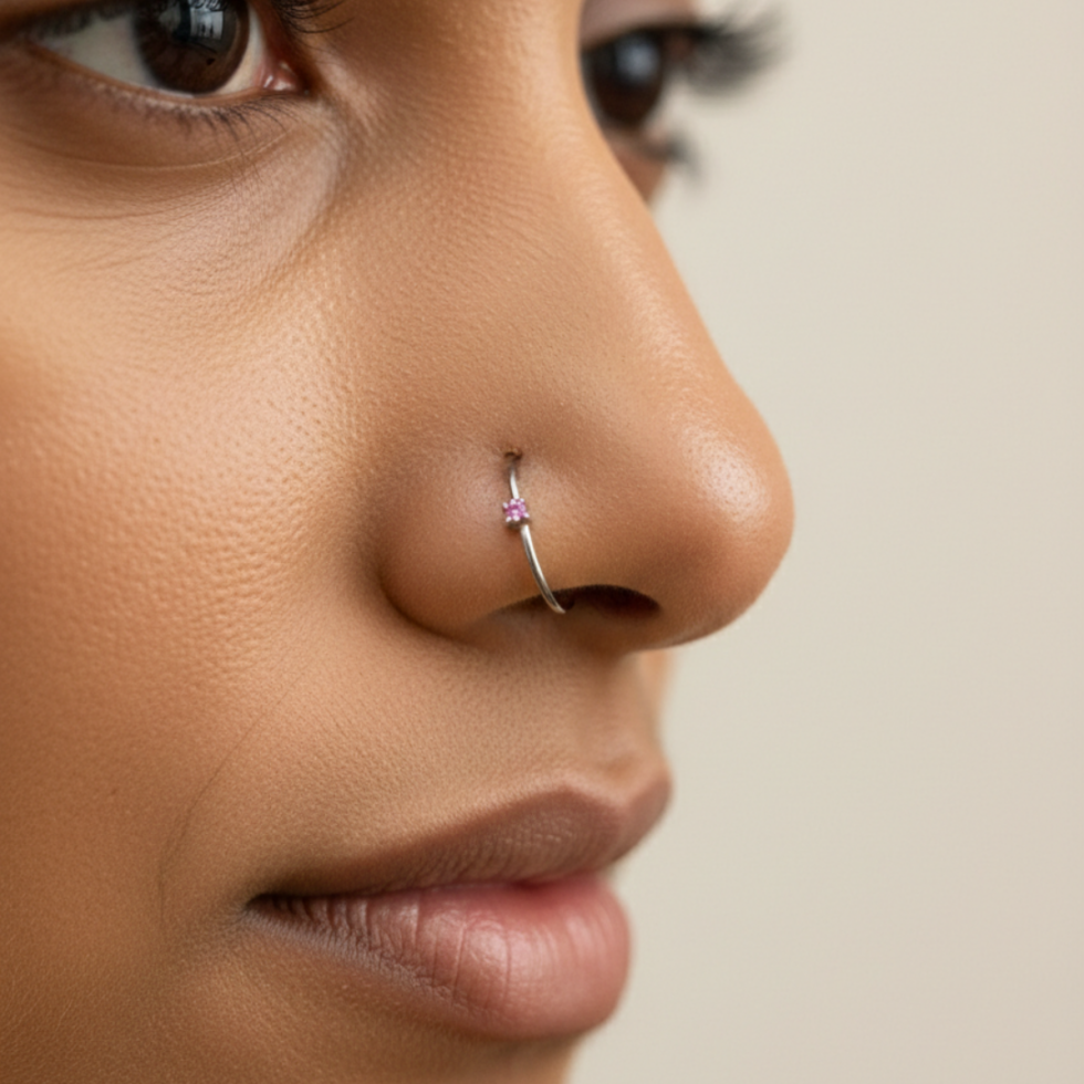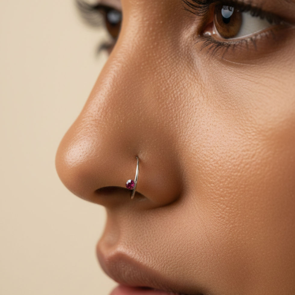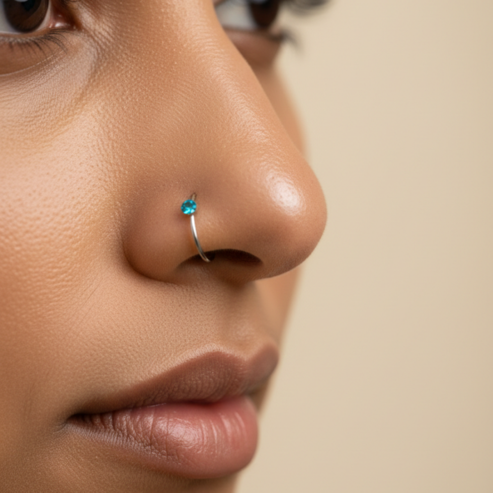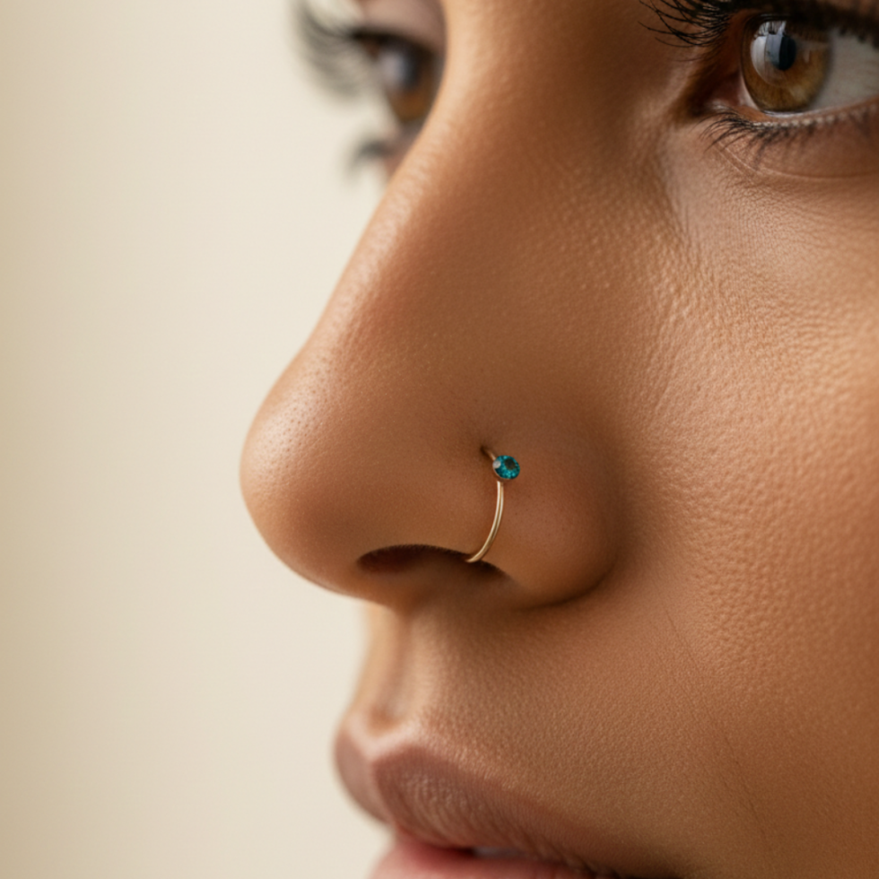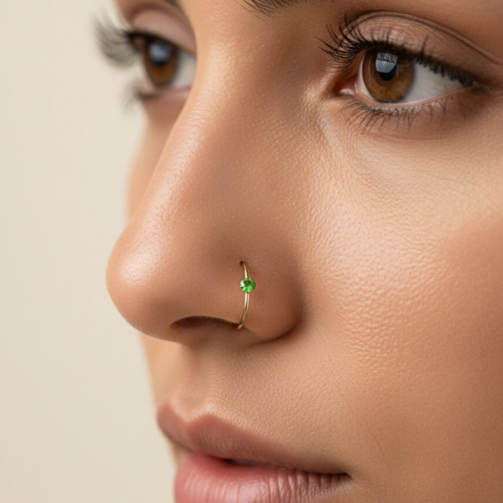 A delicate gold nose ring featuring a tiny colored stone accent. Lightweight, elegant, and available in multiple vibrant shades so you can match it to your mood and style.
