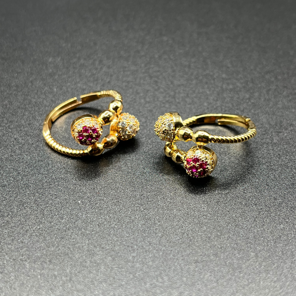 The Ruby Spark Duo Rings blend playful elegance with refined craftsmanship. Designed in a radiant gold-tone finish, each adjustable ring features two pavé-set spheres—one highlighted with rich ruby-red stones and the other with shimmering crystal accents—creating a striking contrast of color and brilliance.