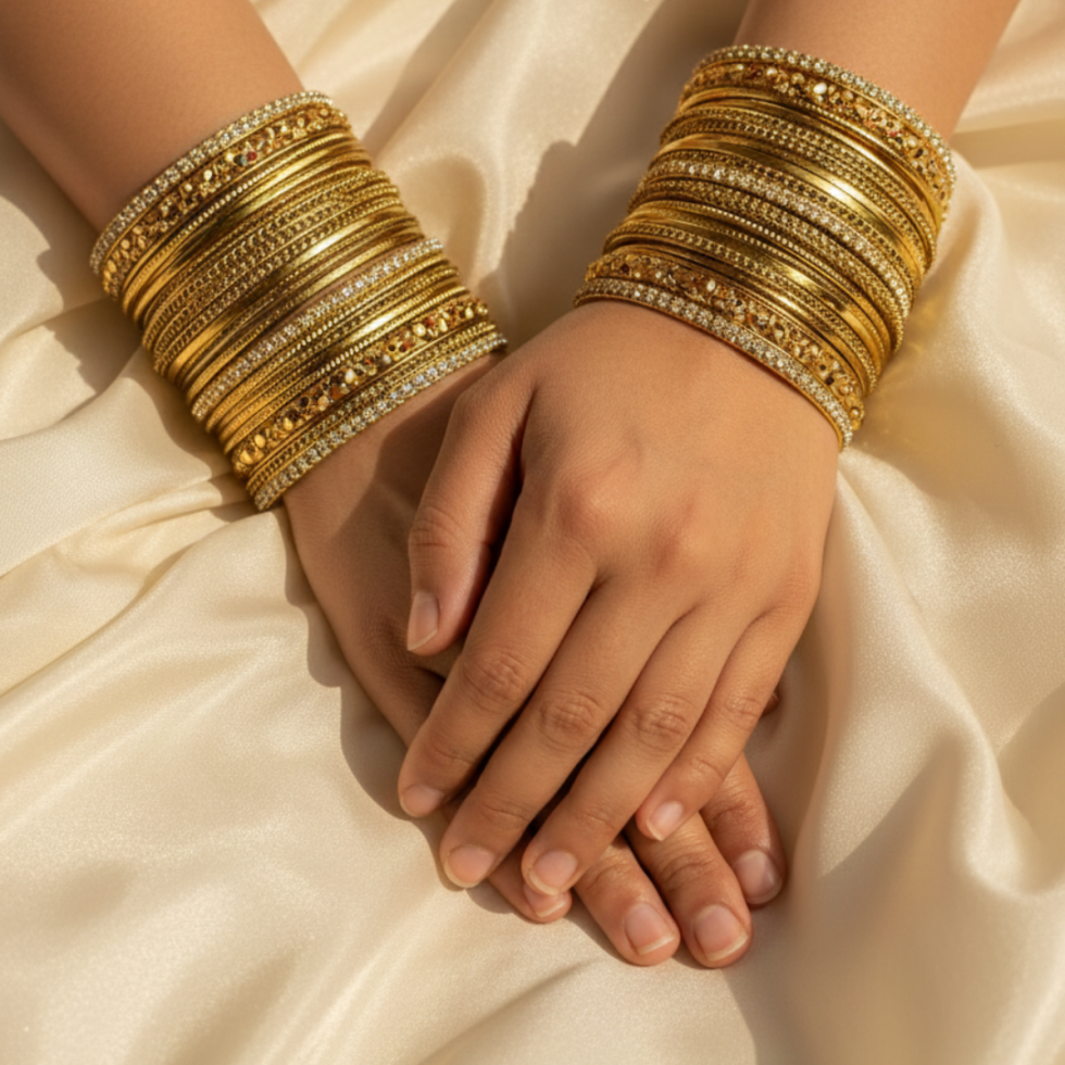 Intricate Artisanal Textures: The collection showcases a breathtaking range of traditional patterns, including delicate latticework (“jaali”), bold twisted rope (“rassa”) designs, and high-shine beaded edges.