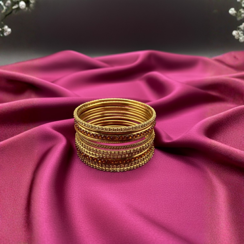 A majestic Sitara-e-Jahan bangle collection, featuring a luxurious array of gold-toned stacks that celebrate the vibrant artistry of South Asian festivities. This ensemble masterfully combines traditional “rassa” (twisted rope) textures with contemporary stone-work and regal hanging “Jhumki” charms for a high-impact bridal aesthetic.