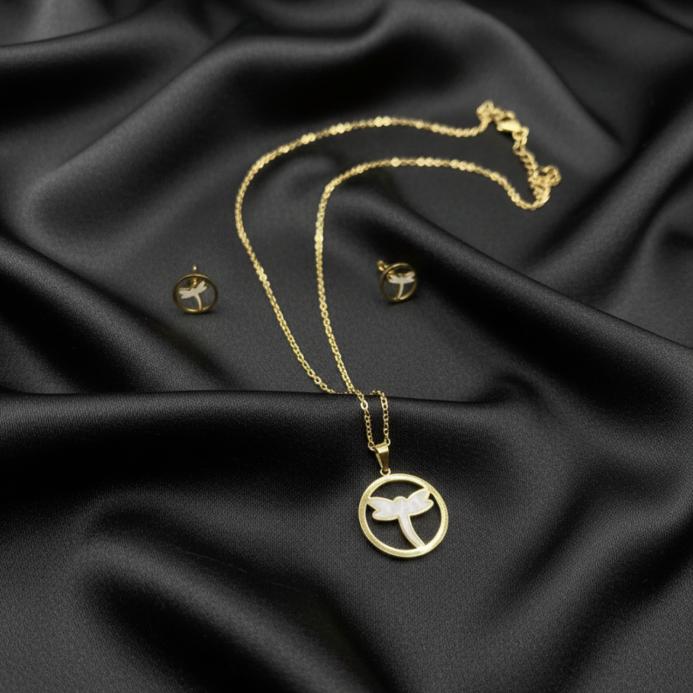 The polished gold finish glows softly against darker backdrops, highlighting its premium craftsmanship without overwhelming the design. Lightweight and comfortable, WingAura is ideal for daily wear while still carrying a deeper symbolic charm. Whether paired with casual attire or formal wear, this set adds a subtle statement of elegance, meaning, and timeless style.