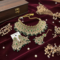Paired with matching statement earrings and a finely crafted maang tikka, this set frames the bride with a balanced and regal presence. The harmony of gold artistry, emerald tones, and pearl detailing creates a look that feels festive, royal, and deeply rooted in tradition. Zamarrud Shehnai is designed for brides who wish to carry a vibrant yet classic elegance on their special day.