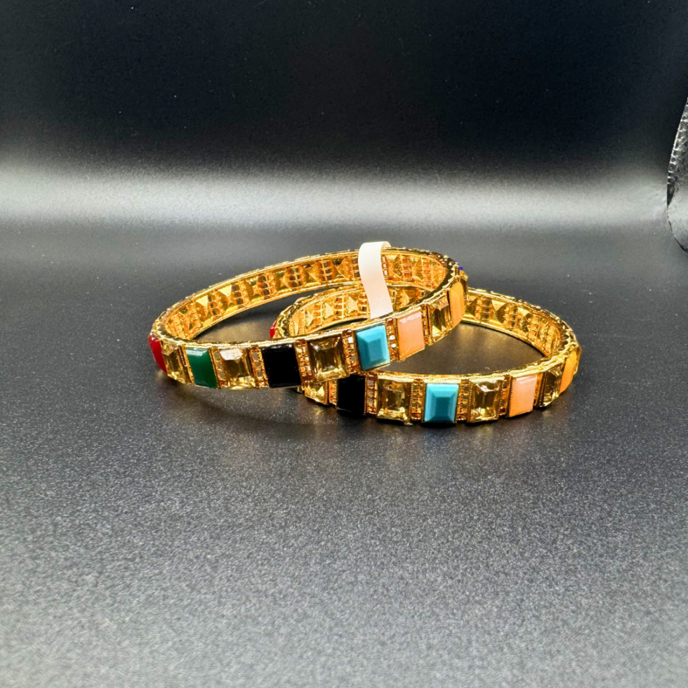 Gold-tone bangles with subtle multicolor stone accents, perfect for a graceful and stylish look.